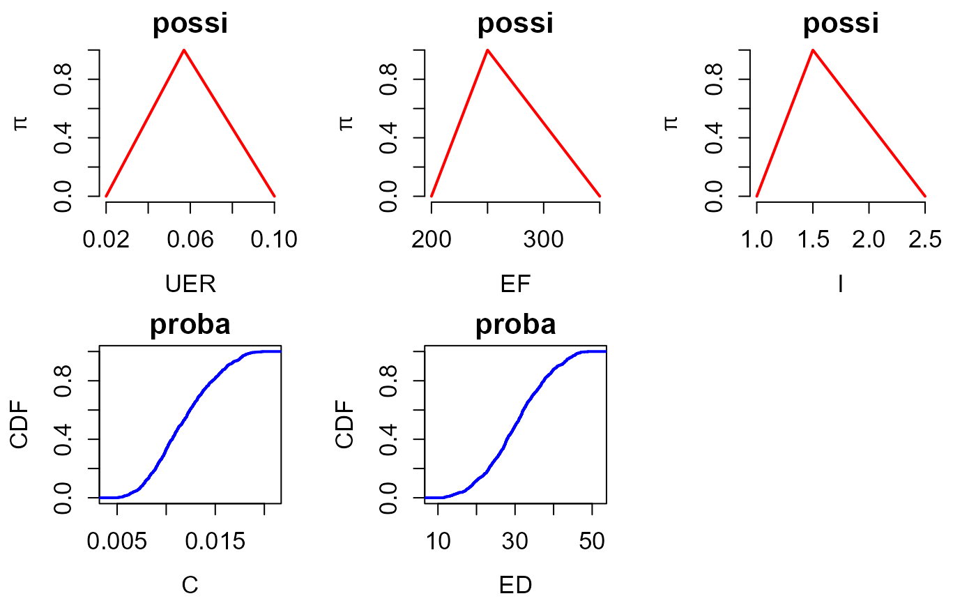 In the case considered, the different parameters are either represented by probabilities (argument type=proba) or by possibilities, either triangular or trapezoidal, (argument type=possi). For instance, if type=“possi” and distr=“triangle”, the parameter is represented by a triangular possibility distribution. The param argument defines the triangle. For example c(0,1,2) corresponds to a possibility distribution with core={1} and support=[0,2]. If type=“possi” and distr=“trapeze”, param should be a vector of four values. For example c(0,1,2,3) corresponds to a possibility distribution with core=[1,2] and support=[0,3].